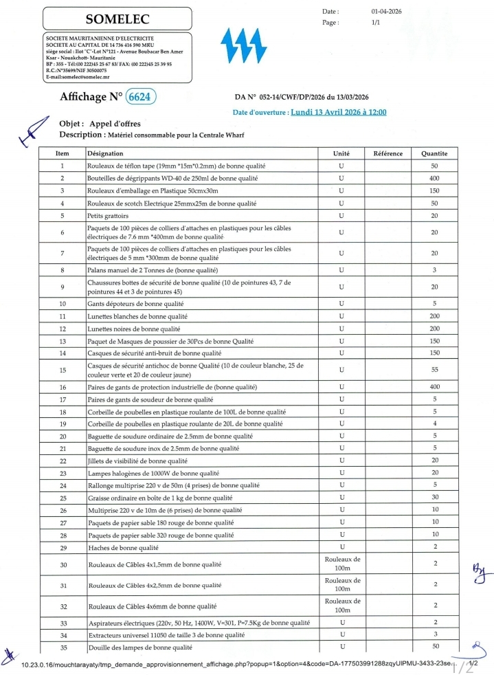 Matériel consommable pour la Centrale Wharf
